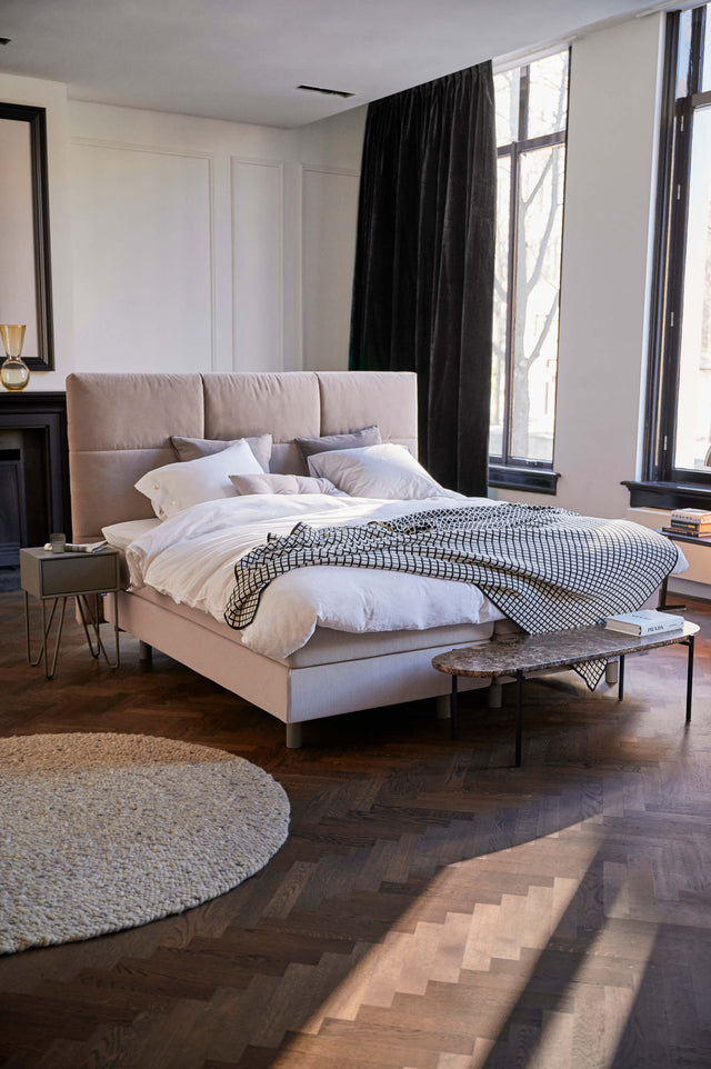 Das Kiruna ist ein reichhaltig gefülltes Boxspringbett: Die Box besteht aus einer Spiralunterfederung und Taschenfedern. Die Auping Unterfederung ist zu 80 % offen, wodurch das Boxspringbett sehr gut belüftet wird. Die Taschenfedern, sowohl in der Box als auch in der Matratze, sorgen dafür, dass Du Dich nachts leicht drehen kannst und im Schlaf gut gestützt wirst.